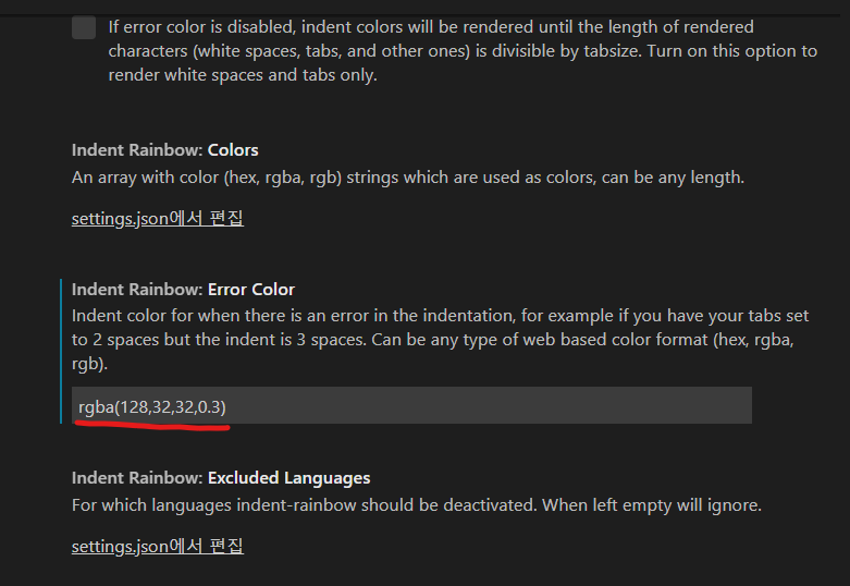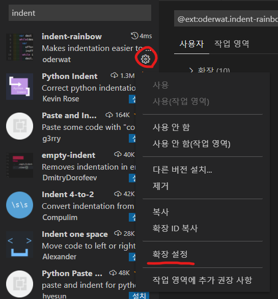 기술 습관/개발 잡학지식 [VSCode 플러그인] indent-rainbow 탭 크기 설정 변경 - Vscode를 새로 깔 때마다 플러그인도 새로 설치하면서, 자꾸 설정하는 방법을 까먹어서 기록해둔다. Vue로 프로젝트 코딩할 때, 현재 디폴트는 스페이스 두번인데 indent-rainbow는 스페이스 네번이 기본 설정이라 변경해주어야 한다. 먼저 확장에서 indent-rainbow를 검색해주고 빨간 원의 세팅 아이콘을 눌러 확장 설정으로 간 후 해당 부분의 rgba를 변경해주면 된다. 기본 값은 맨 끝이 0.3이 아닌 0.6인데 이게 스페이스 네번을 의미한다. 나는 두번으로 줄여줘야하므로 0.3으로 변경해주었다. 공유하기 게시글 관리 기술 습관 '기술 습관 > 개발 잡학지식' 카테고리의 다른 글 [Docker] Windows에서 Docker를 사용하면 좋은 이유? 혹은 좋지 않은 이유? (1) 2024.03.23 [IntelliJ] 코드 복사 붙여넣기(CV)도 안되고 자꾸 Insert가 눌릴 때 (0) 2024.03.14 개발자를 위한 타자 연습 사이트 (0) 2020.02.15 Contents 당신이 좋아할만한 콘텐츠 [Docker] Windows에서 Docker를 사용하면 좋은 이유? 혹은 좋지 않은 이유? 2024.03.23 [IntelliJ] 코드 복사 붙여넣기(CV)도 안되고 자꾸 Insert가 눌릴 때 2024.03.14 개발자를 위한 타자 연습 사이트 2020.02.15 댓글 1 + 이전 댓글 더보기